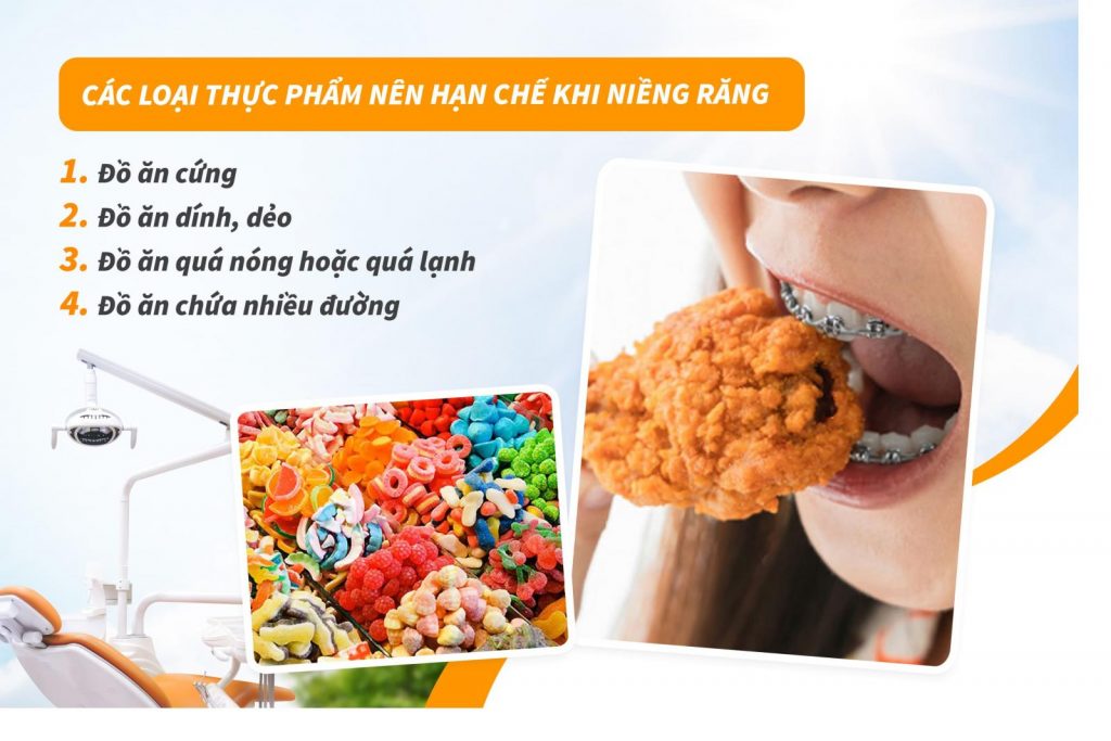 - Hạn chế một số loại thực phẩm: tránh đồ cứng, dai, dẻo dễ làm bung mắc cài